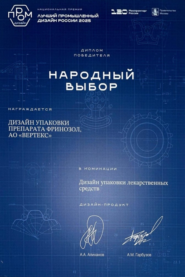 Международная фармацевтическая премия "Зеленый Крест": «Фринозол®» - бренд года в номинации «Препарат выбора для лечения ринитов и синуситов», 2020 г.