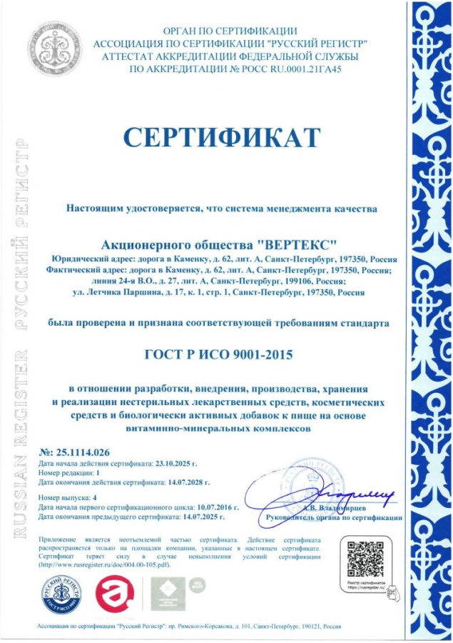В 2025 году после прохождения ресертификационного аудита "ВЕРТЕКС" получил новые сертификаты соответствия требованиям стандарта ГОСТ Р ИСО 22000-2019 «Системы менеджмента безопасности пищевой продукции. Требования к организациям, участвующим в цепи создания пищевой продукции» (производство, хранение и реализация биологически активных добавок)
